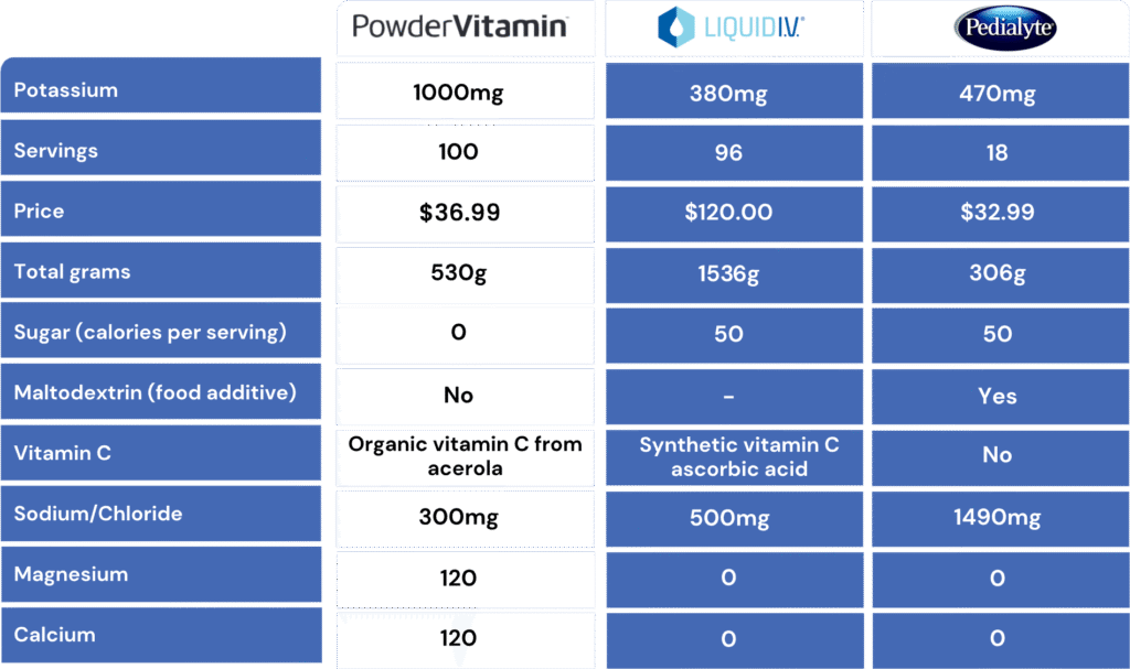 Electrolytes Powder Plus™ contains 1000 mg of potassium as opposed to only 250 mg in other brands. Additionally, we offer a unique flavor and blend of Magnesium, Calcium, and Pink Himalayan salt. Our delicious and hydrating blend of Unflavored flavor includes 50 servings.