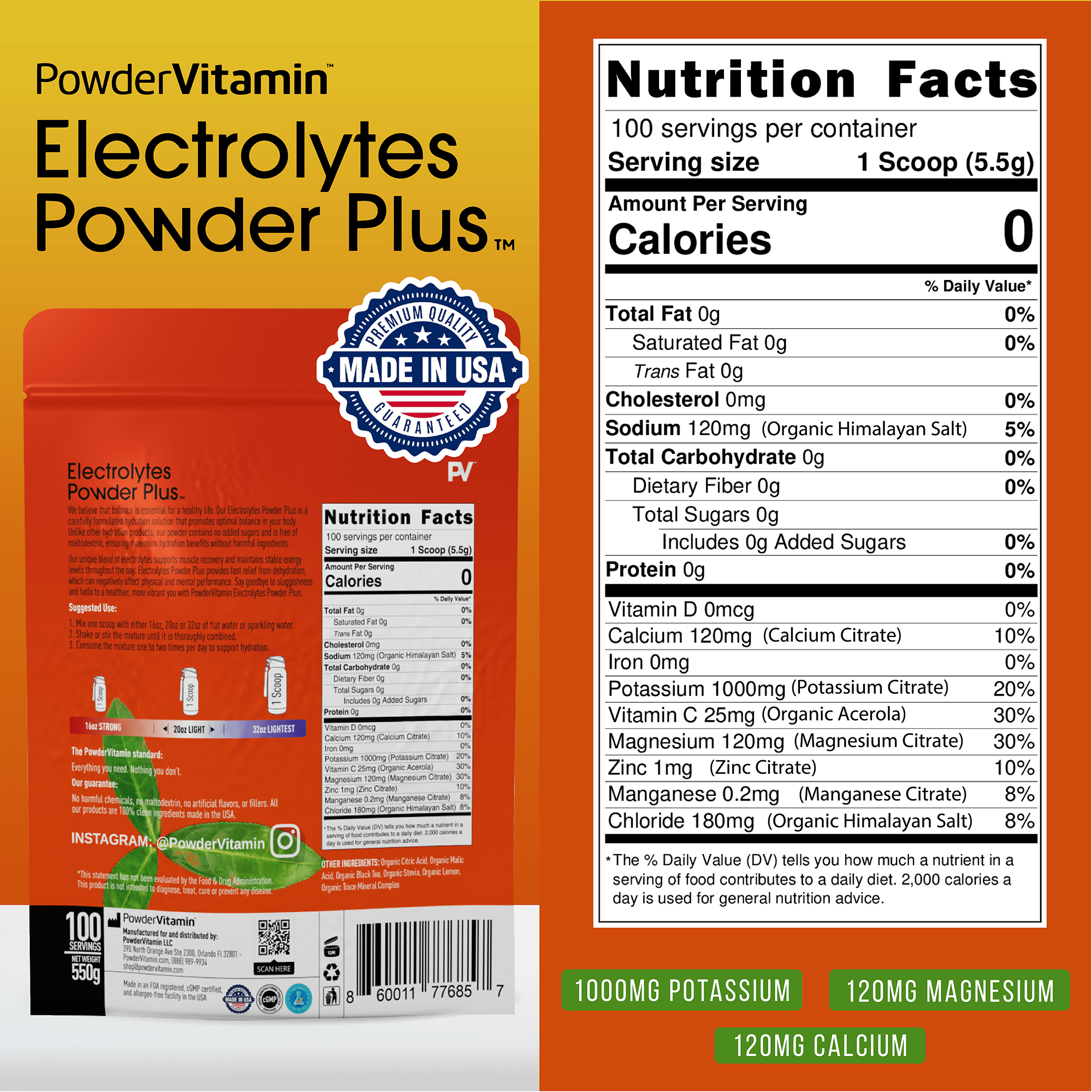 Electrolyte Powder Plus by PowderVitamin offers a range of dietary supplements in convenient powder form, making it easier to mix with your favorite drinks or meals. Unlike traditional pills, our powders provide a fast, effective way to absorb essential nutrients without the need to swallow tablets. PowderVitamin is formulated to be highly bioavailable, allowing for optimal absorption in the body. The fine powder form enables quick and efficient absorption, making it a convenient choice for individuals looking to boost their nutrient intake.