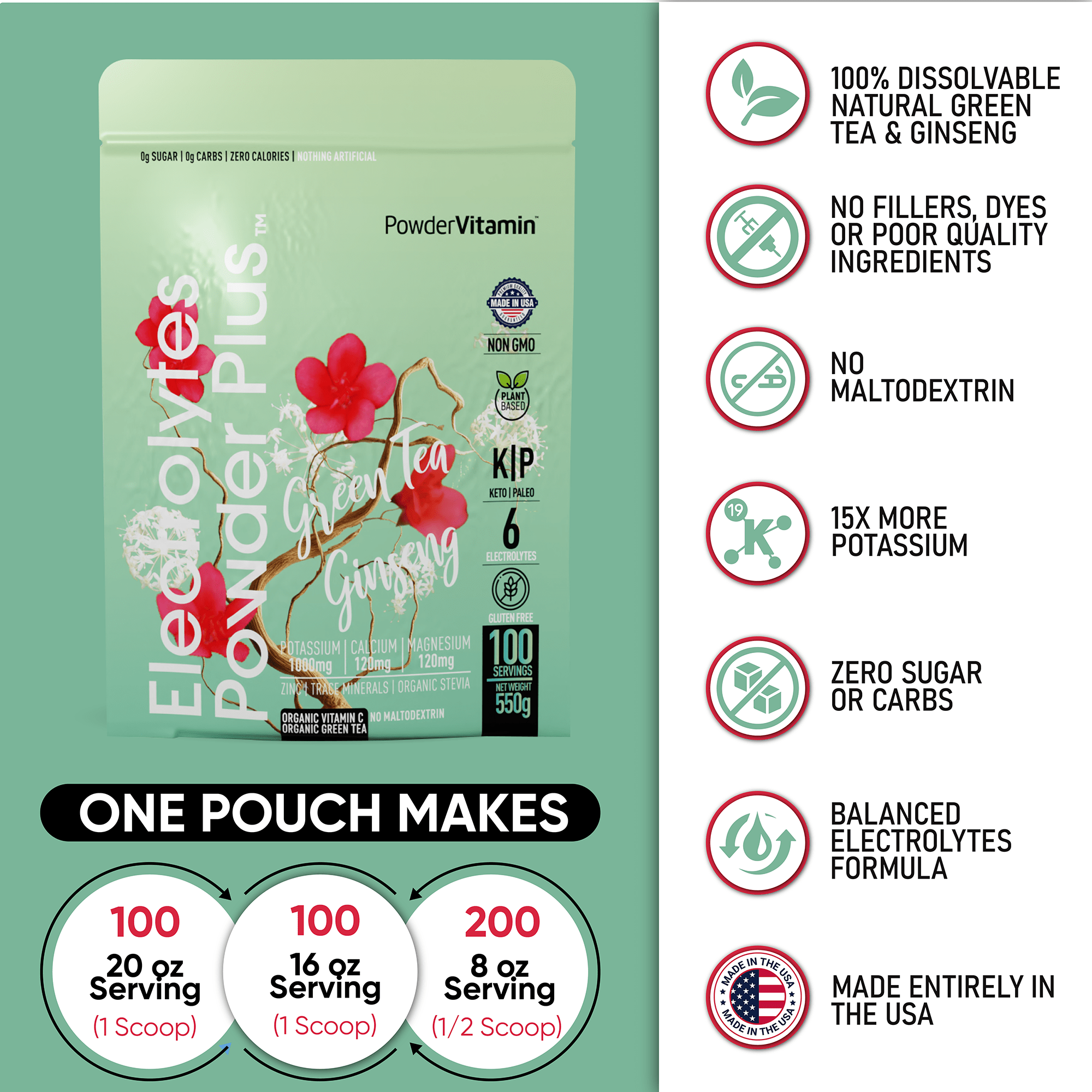 Electrolytes Powder Plus comes in 100-, 50-, or 20-serving pouches and 30-count single-servinghydration packets. It currently comes in 20 delicious, natural flavors including unflavored, lemonade, raspberry, raspberrylemonade, watermelon, orange pineapple, blueberry grape, guava kiwi, mango passionfruit, strawberry, strawberry cucumber, tangerine pineapple, grape, hibiscus, strawberry kiwi, black tea lemonade, black tea ginseng, green tea ginseng, black tea hibiscus, and unsweetened organic black tea.