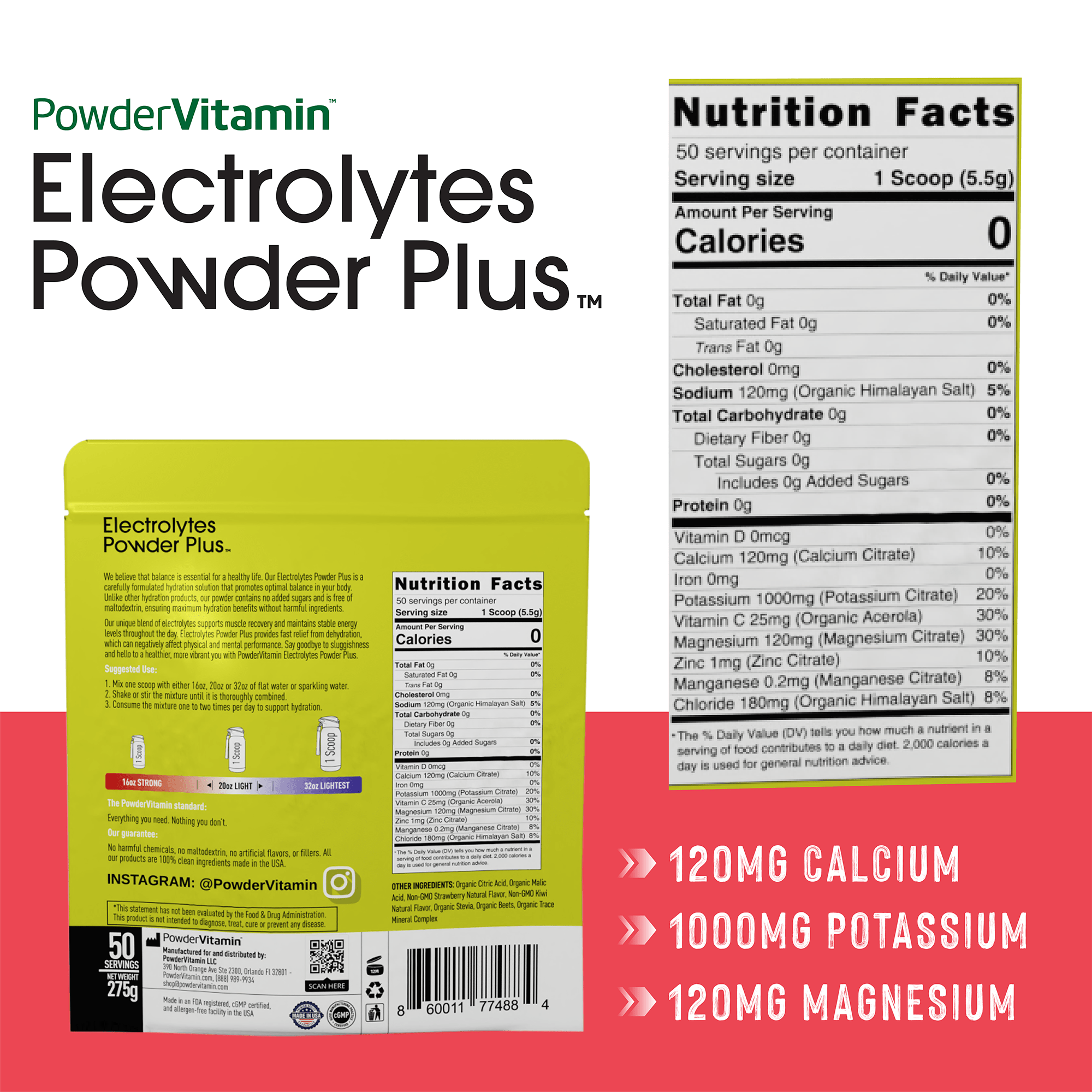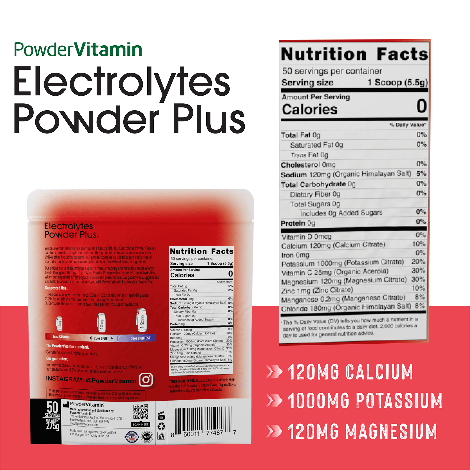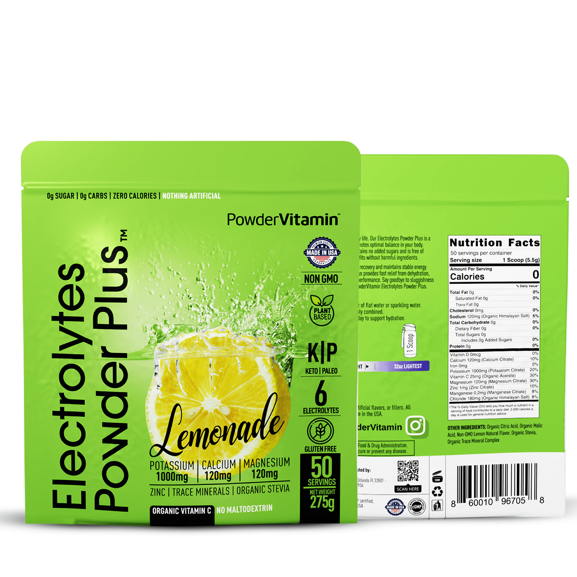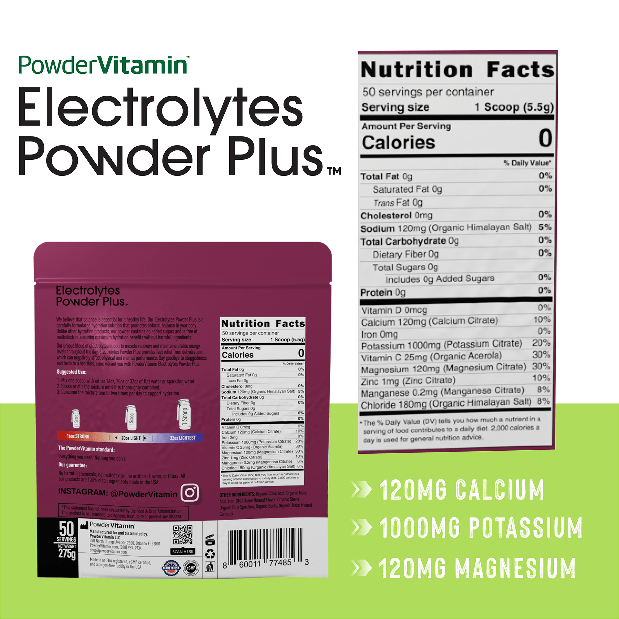 Electrolytes Powder Plus™ is a premium electrolyte beverage powder designed to replenish essential electrolytes like potassium, magnesium, calcium, and sodium (organic Himalayan salt). It contains 1000 mg of potassium per serving, significantly more than most competing products, and is formulated to support hydration, muscle function, recovery, and overall wellness.