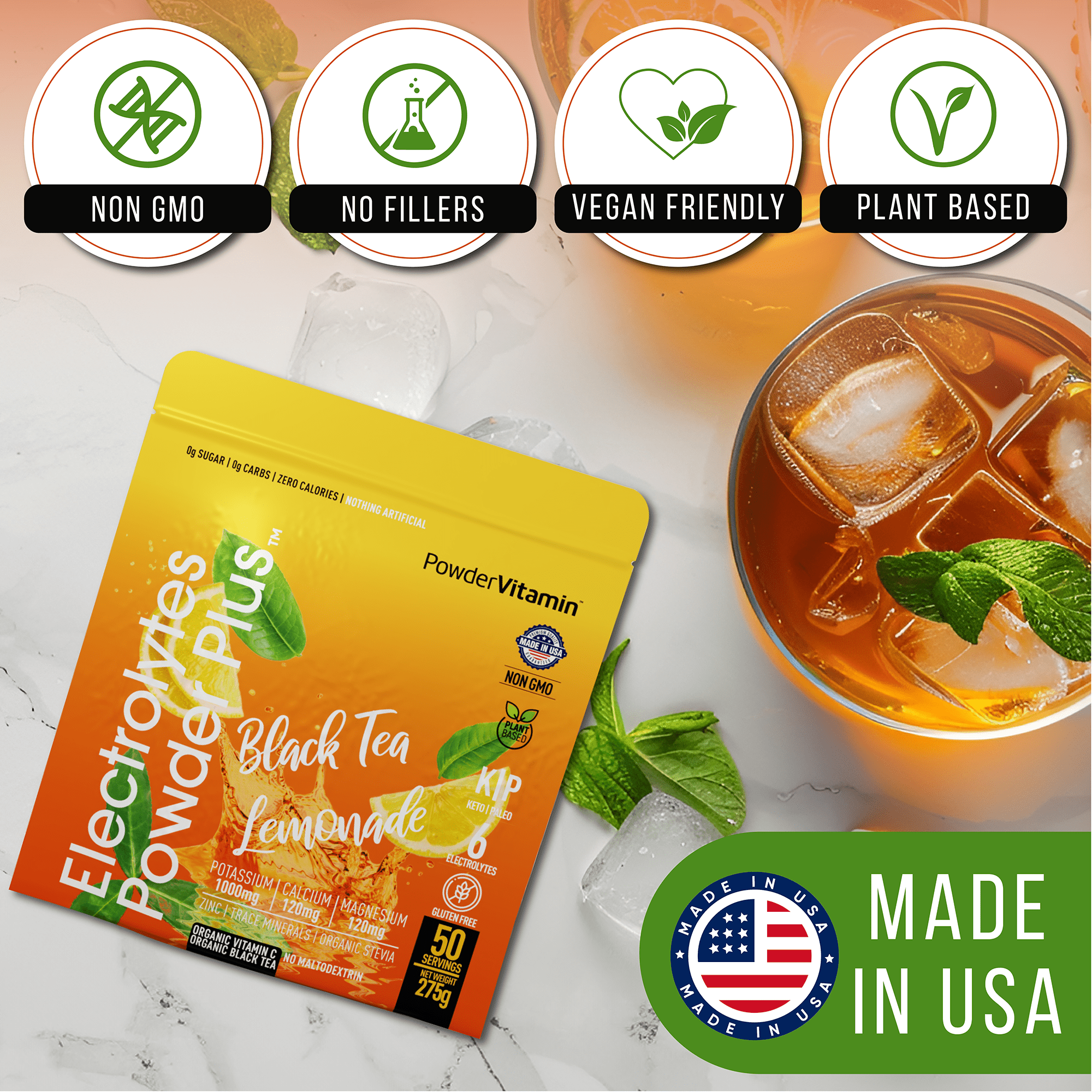 No, no and no! We promise, we never use synthetic colors, artificial flavors or sweeteners. All PowderVitamin Electrolytes Powder Plus colors and flavors come from fruit and vegetable extracts. Our sweetener is Organic Stevia Leaf Extract free of Maltodextrin. We also do not use any stimulants like caffeine. And our products are gluten-free, vegan, Paleo, Keto and Non-GMO.