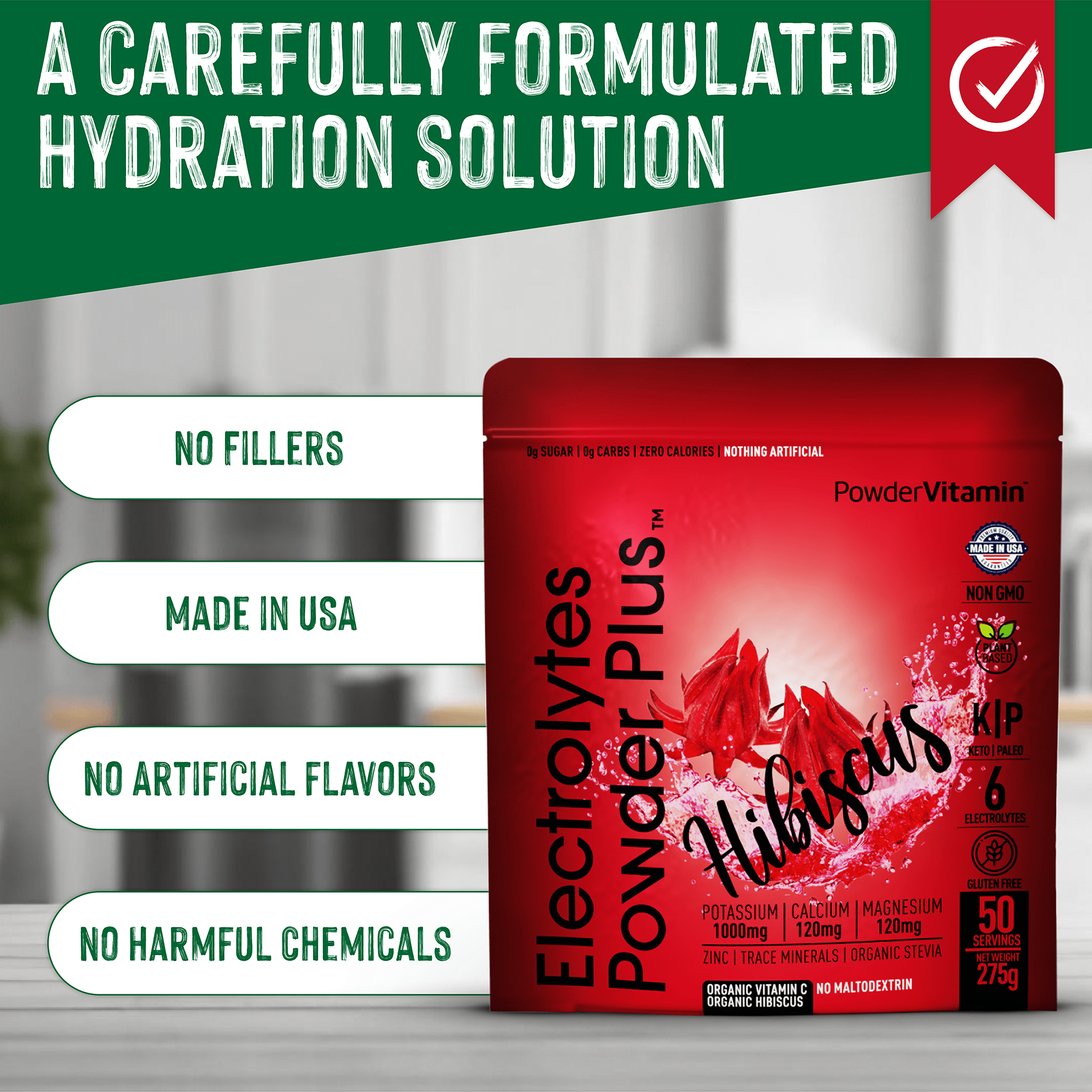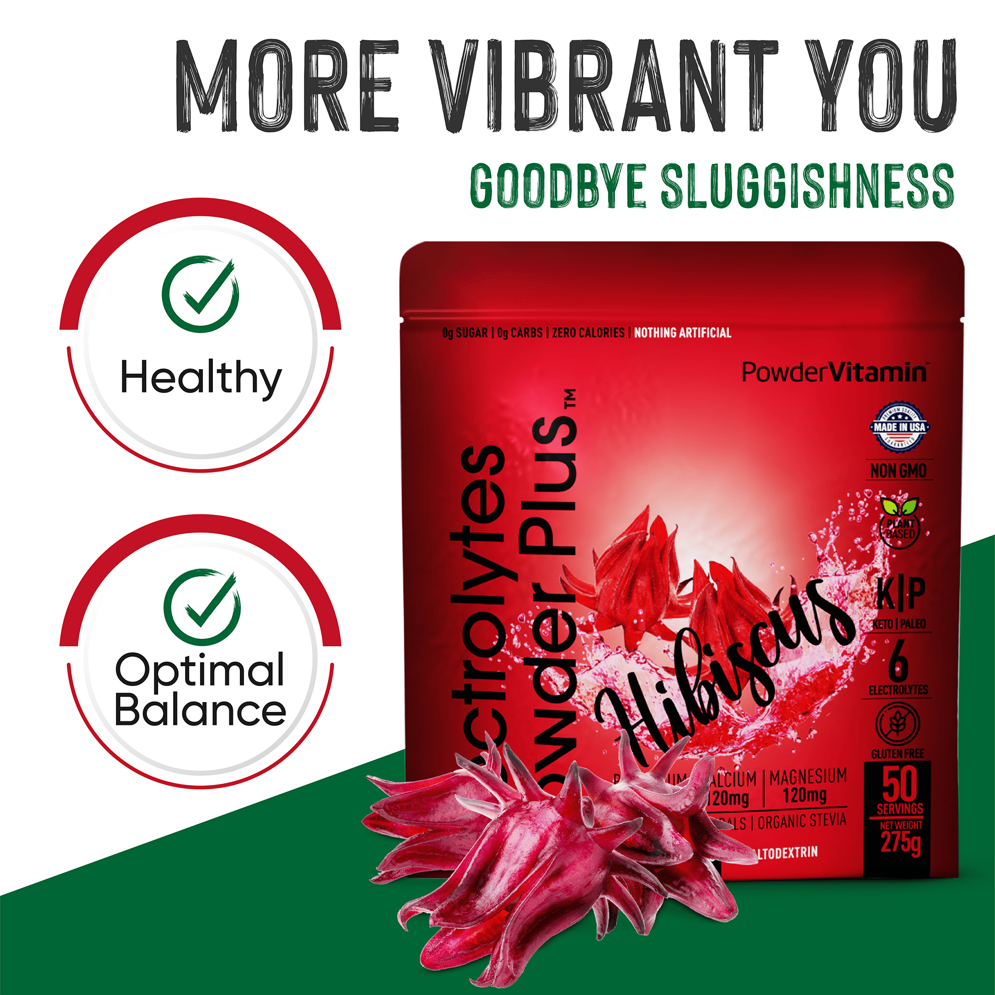 No, no and no! We promise, we never use synthetic colors, artificial flavors or sweeteners. All PowderVitamin Electrolytes Powder Plus colors and flavors come from fruit and vegetable extracts. Our sweetener is Organic Stevia Leaf Extract free of Maltodextrin. We also do not use any stimulants like caffeine. And our products are gluten-free, vegan, Paleo, Keto and Non-GMO.