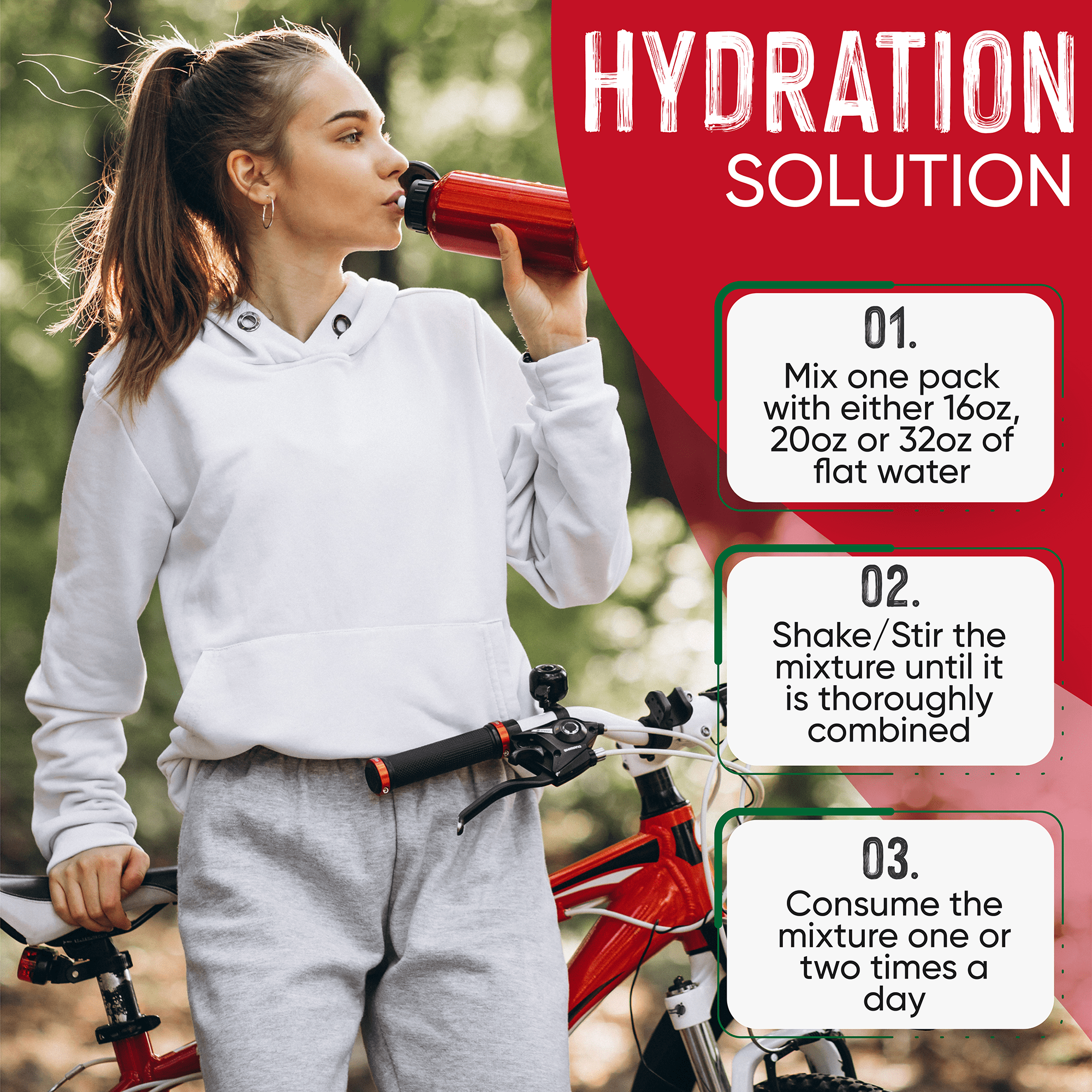 Pretty simple, just add water and shake or stir well. A couple of tips: our suggested serving size is 16 ounces to 20 ounces. So use one Electrolytes Powder Plus scoop (equal to a half teaspoon) to make a serving. You drink Electrolytes Powder Plus cold.