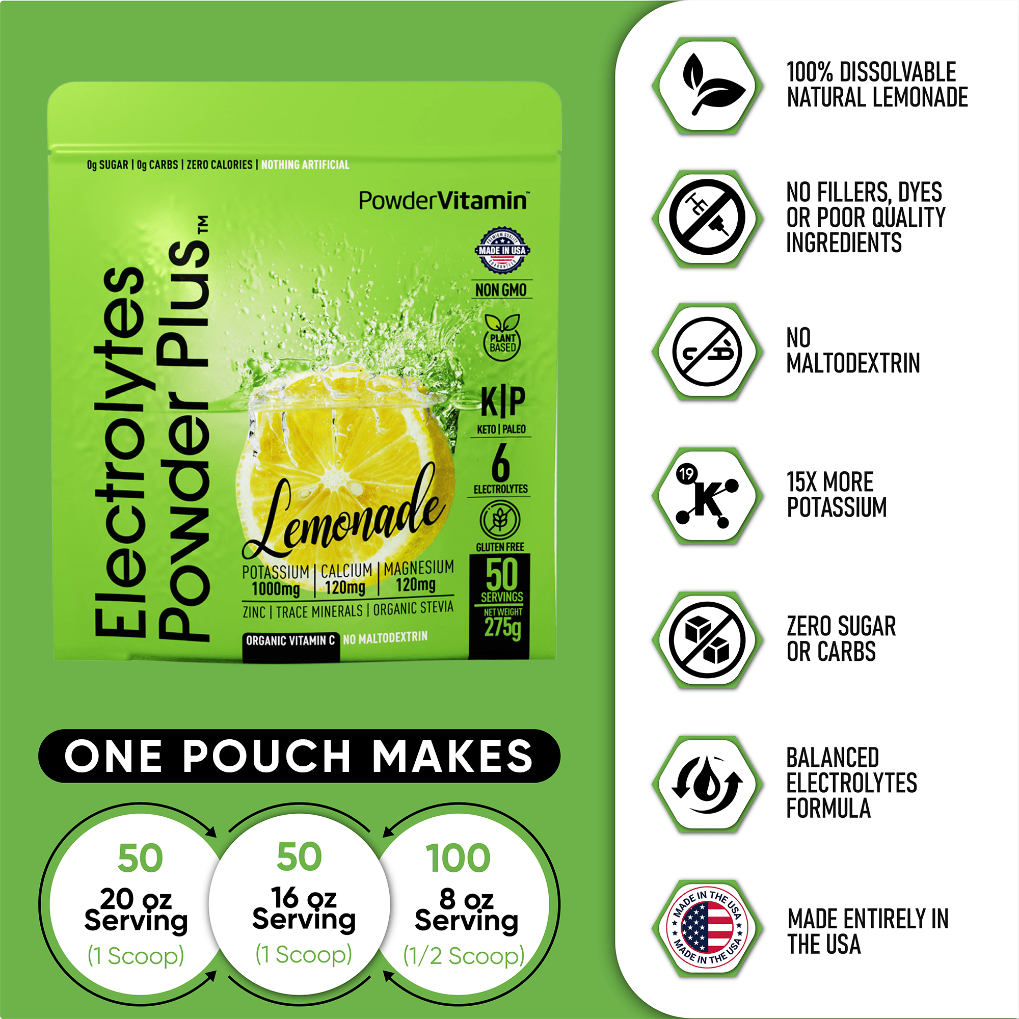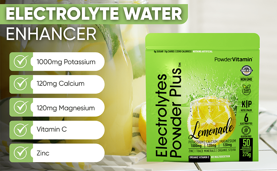 Electrolyte Powder: Electrolytes Powder Plus contains 1000 mg of potassium opposed to only 250 mg in other brands. Additionally, we offer a unique flavor and blend of Magnesium, Calcium, Pink Himalayan salt. Our delicious and hydrating blend of lemonade flavor includes 50 servings.
