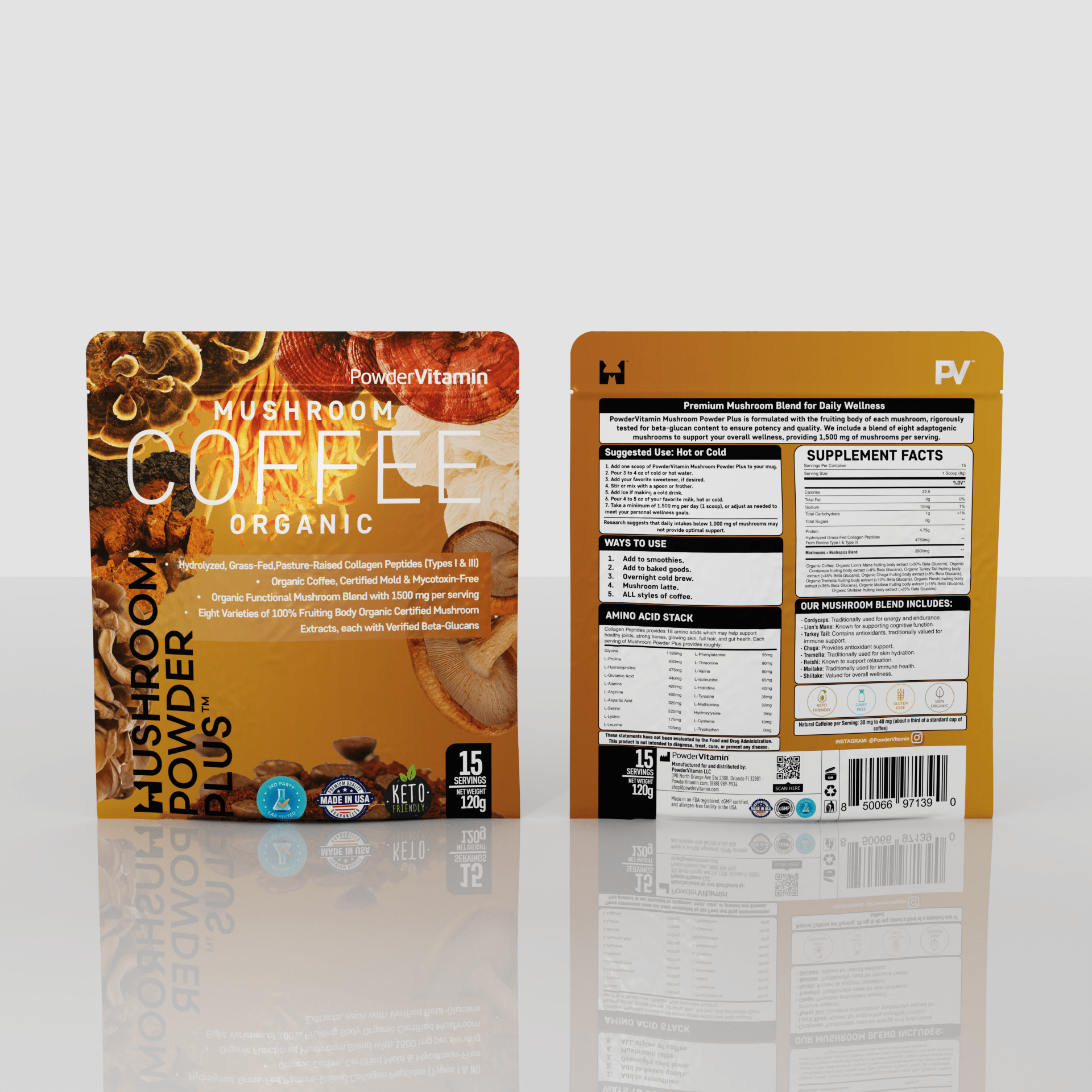 Mushroom Powder Plus is packed with essential nutrients, including polysaccharides, antioxidants, and vitamin D, which support immune health, the nervous system, memory, and overall well-being.