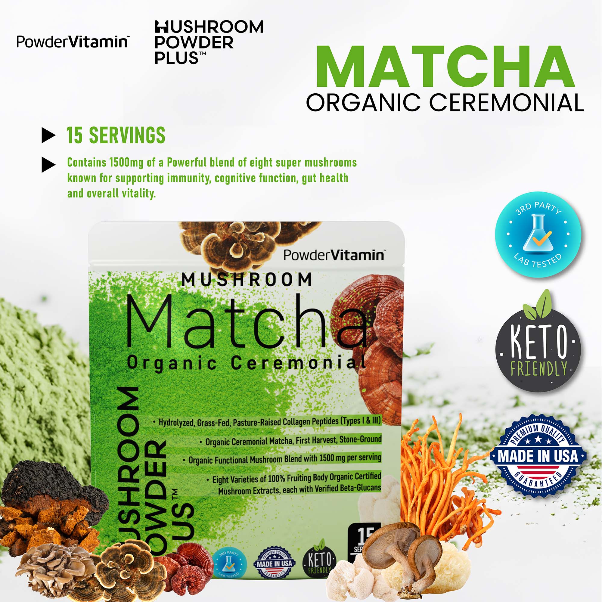 Mushroom Powder Plus is packed with essential nutrients, including polysaccharides, antioxidants, and vitamin D, which support immune health, the nervous system, memory, and overall well-being.