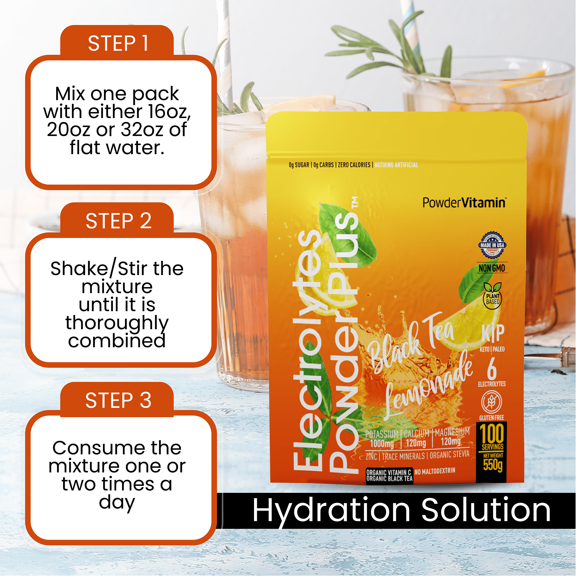 Pretty simple, just add water and shake or stir well. A couple of tips: our suggested serving size is 16 ounces to 20 ounces. So use one Electrolytes Powder Plus scoop (equal to a half teaspoon) to make a serving. You drink Electrolytes Powder Plus cold.