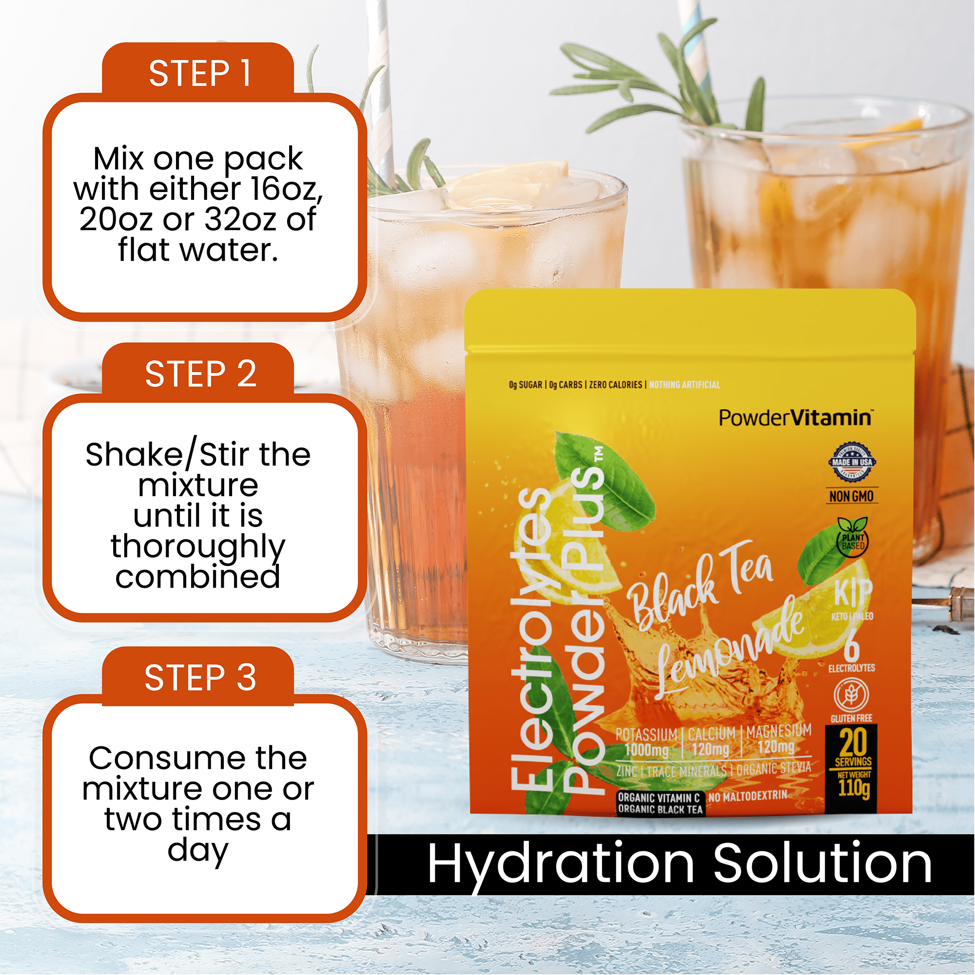 Pretty simple, just add water and shake or stir well. A couple of tips: our suggested serving size is 16 ounces to 20 ounces. So use one Electrolytes Powder Plus scoop (equal to a half teaspoon) to make a serving. You drink Electrolytes Powder Plus cold.