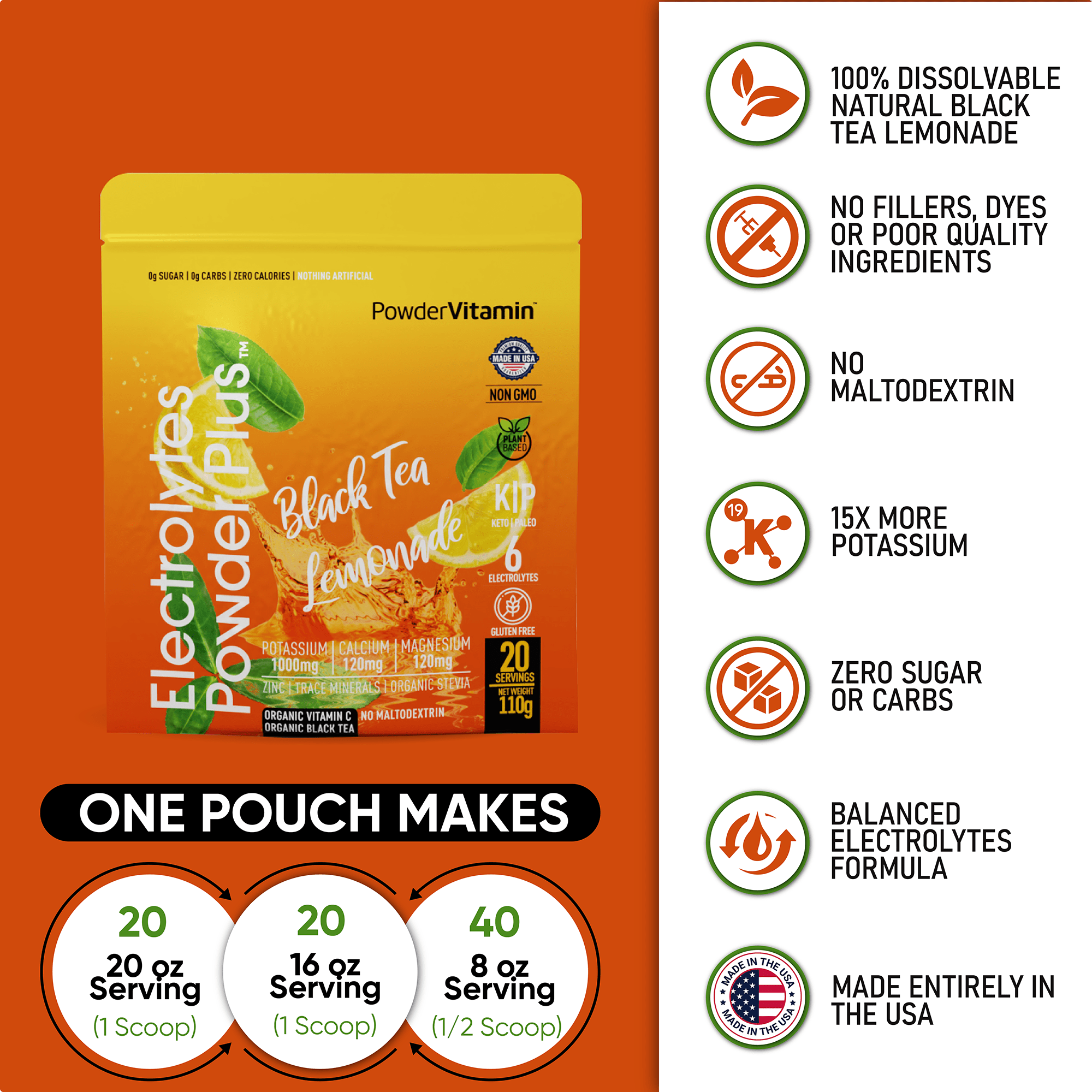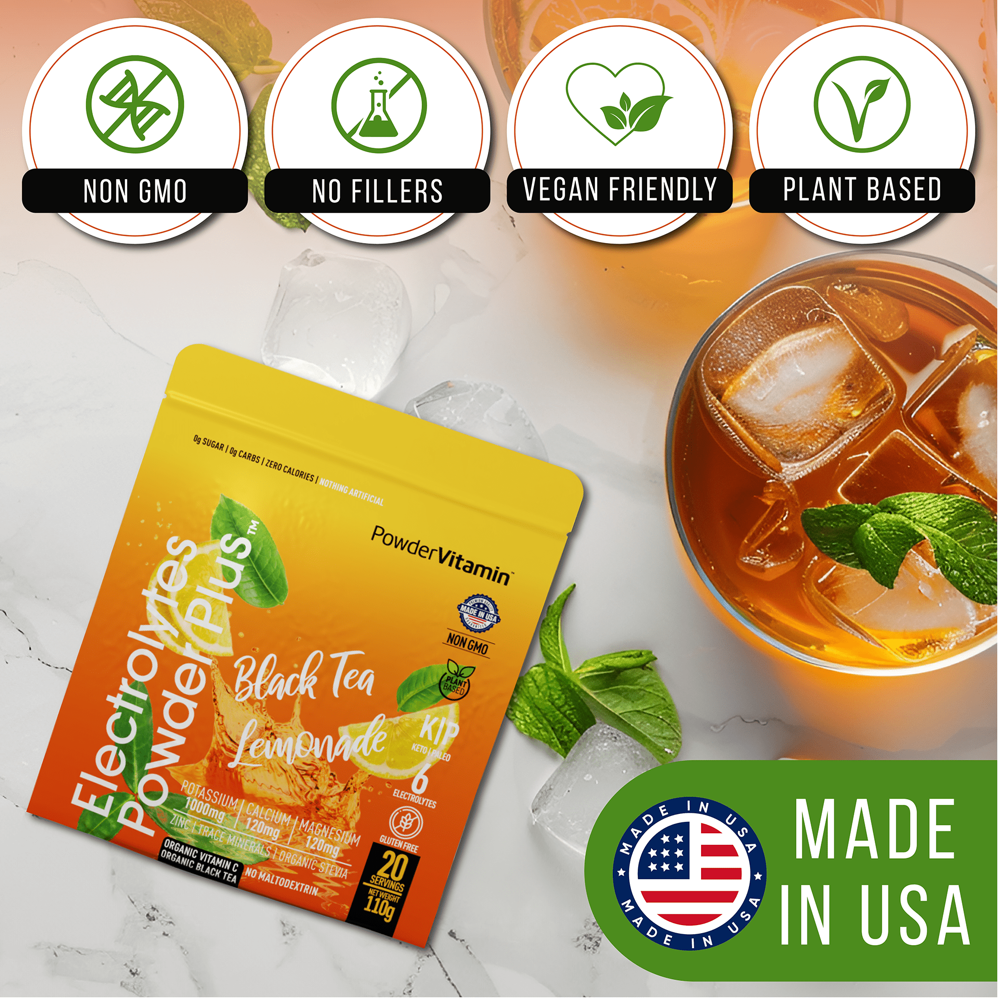 No, no and no! We promise, we never use synthetic colors, artificial flavors or sweeteners. All PowderVitamin Electrolytes Powder Plus colors and flavors come from fruit and vegetable extracts. Our sweetener is Organic Stevia Leaf Extract free of Maltodextrin. We also do not use any stimulants like caffeine. And our products are gluten-free, vegan, Paleo, Keto and Non-GMO.
