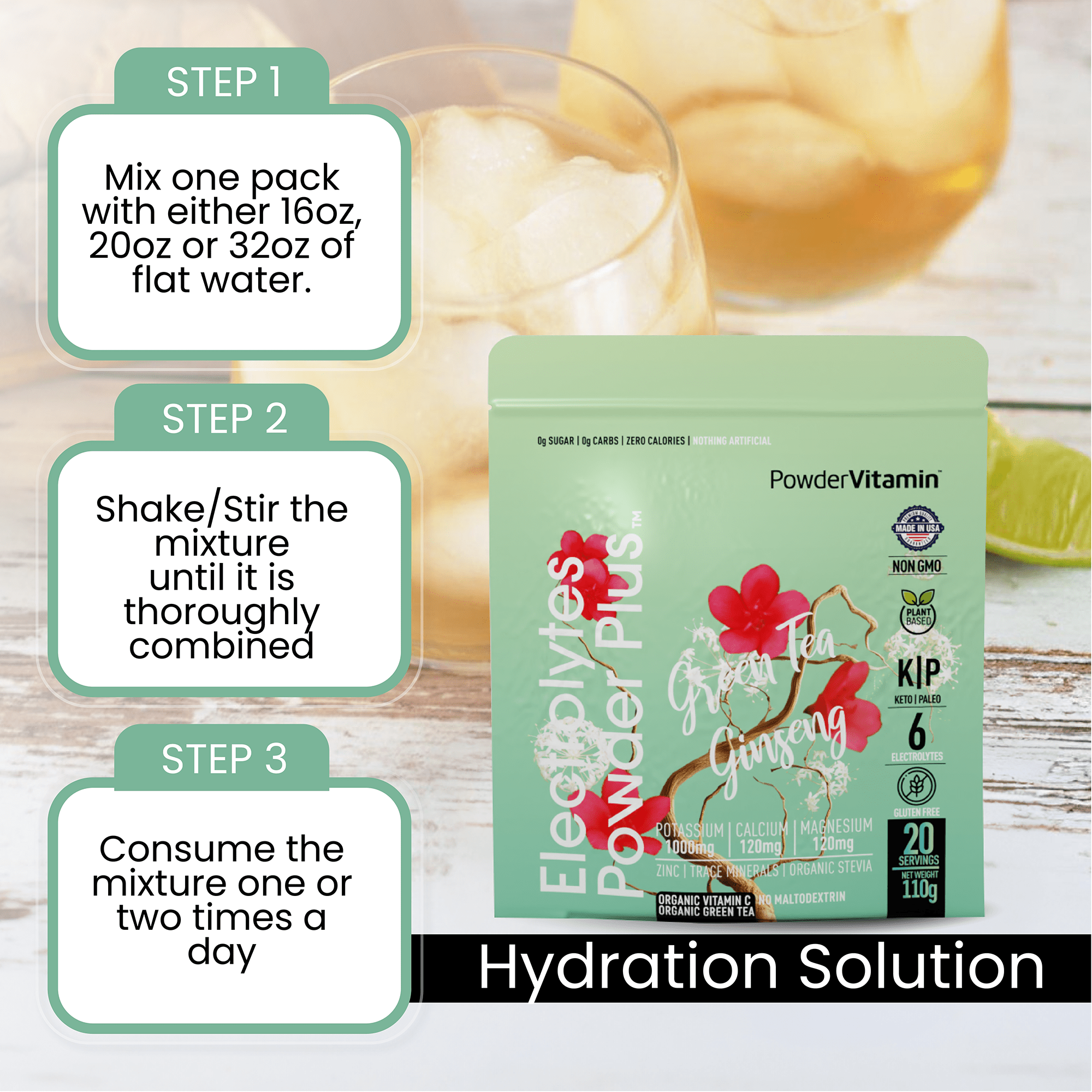 Pretty simple, just add water and shake or stir well. A couple of tips: our suggested serving size is 16 ounces to 20 ounces. So use one Electrolytes Powder Plus scoop (equal to a half teaspoon) to make a serving. You drink Electrolytes Powder Plus cold.