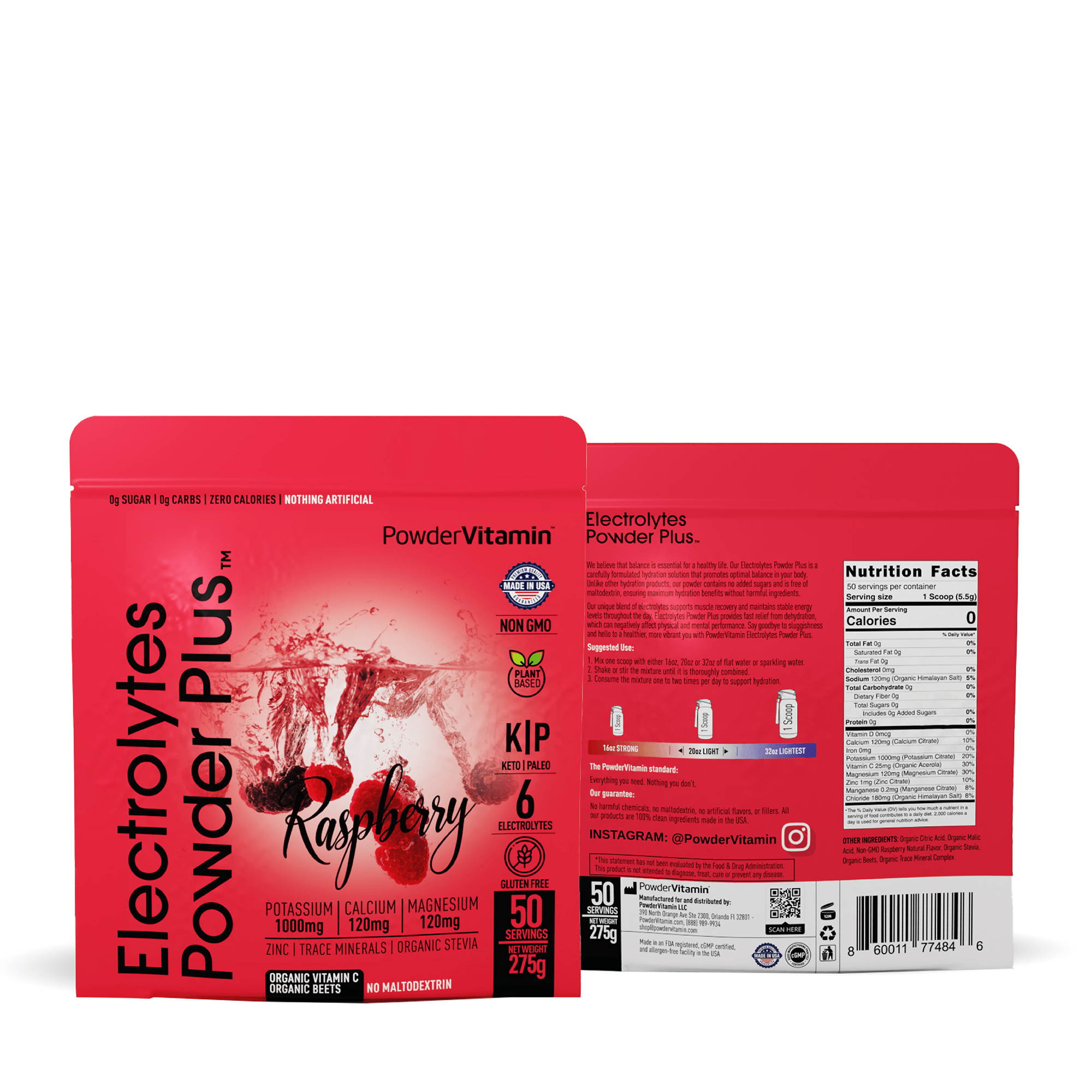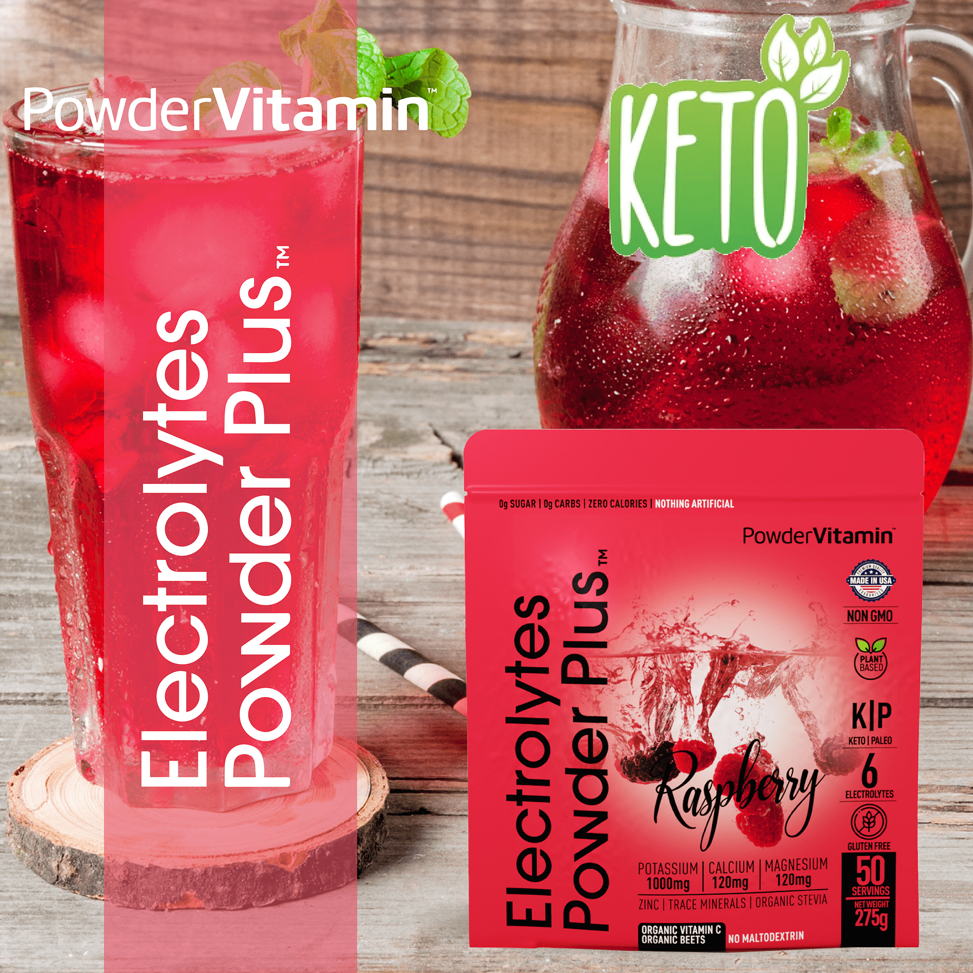 No, no and no! We promise, we never use synthetic colors, artificial flavors or sweeteners. All PowderVitamin Electrolytes Powder Plus colors and flavors come from fruit and vegetable extracts. Our sweetener is Organic Stevia Leaf Extract free of Maltodextrin. We also do not use any stimulants like caffeine. And our products are gluten-free, vegan, Paleo, Keto and Non-GMO.