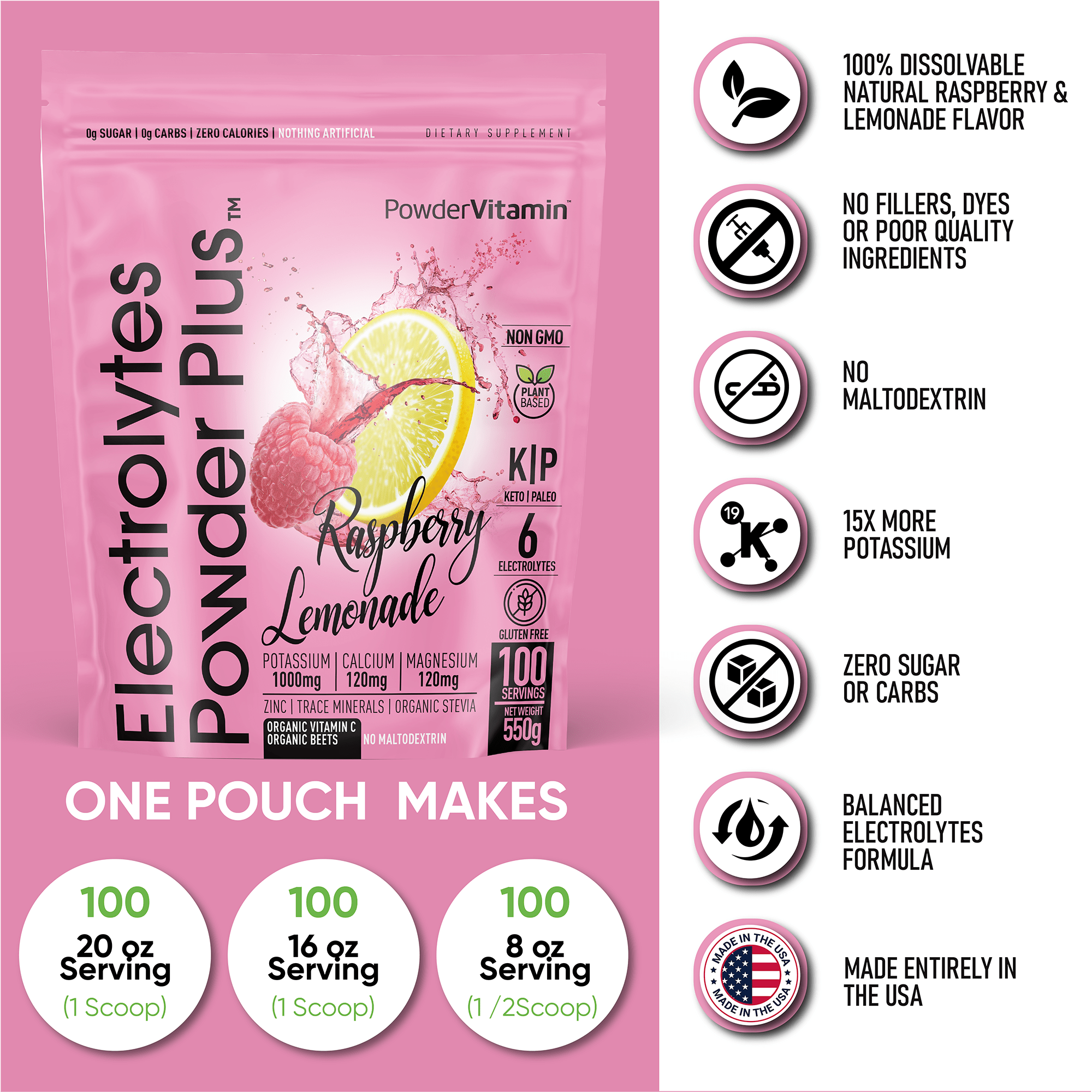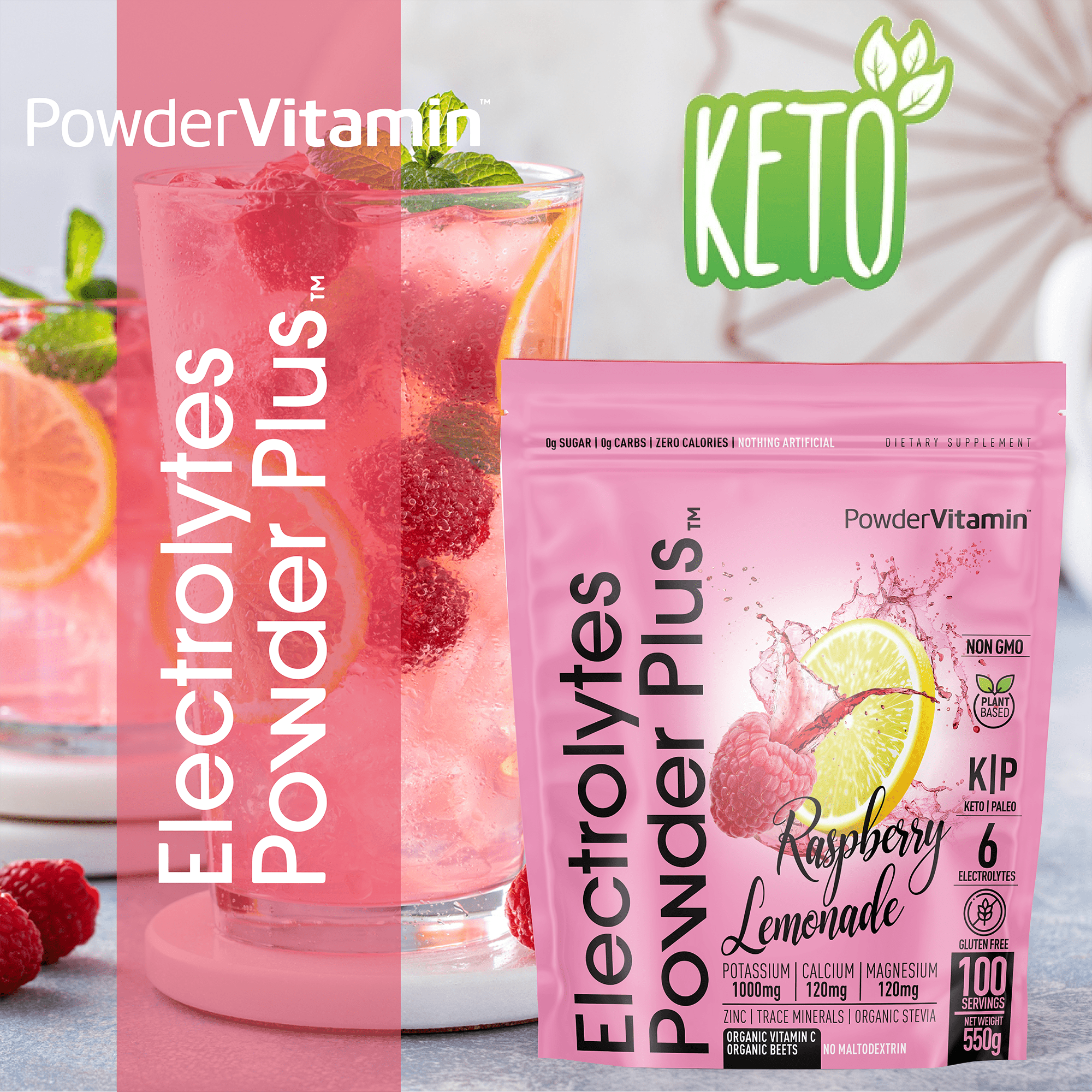 No, no and no! We promise, we never use synthetic colors, artificial flavors or sweeteners. All PowderVitamin Electrolytes Powder Plus colors and flavors come from fruit and vegetable extracts. Our sweetener is Organic Stevia Leaf Extract free of Maltodextrin. We also do not use any stimulants like caffeine. And our products are gluten-free, vegan, Paleo, Keto and Non-GMO.