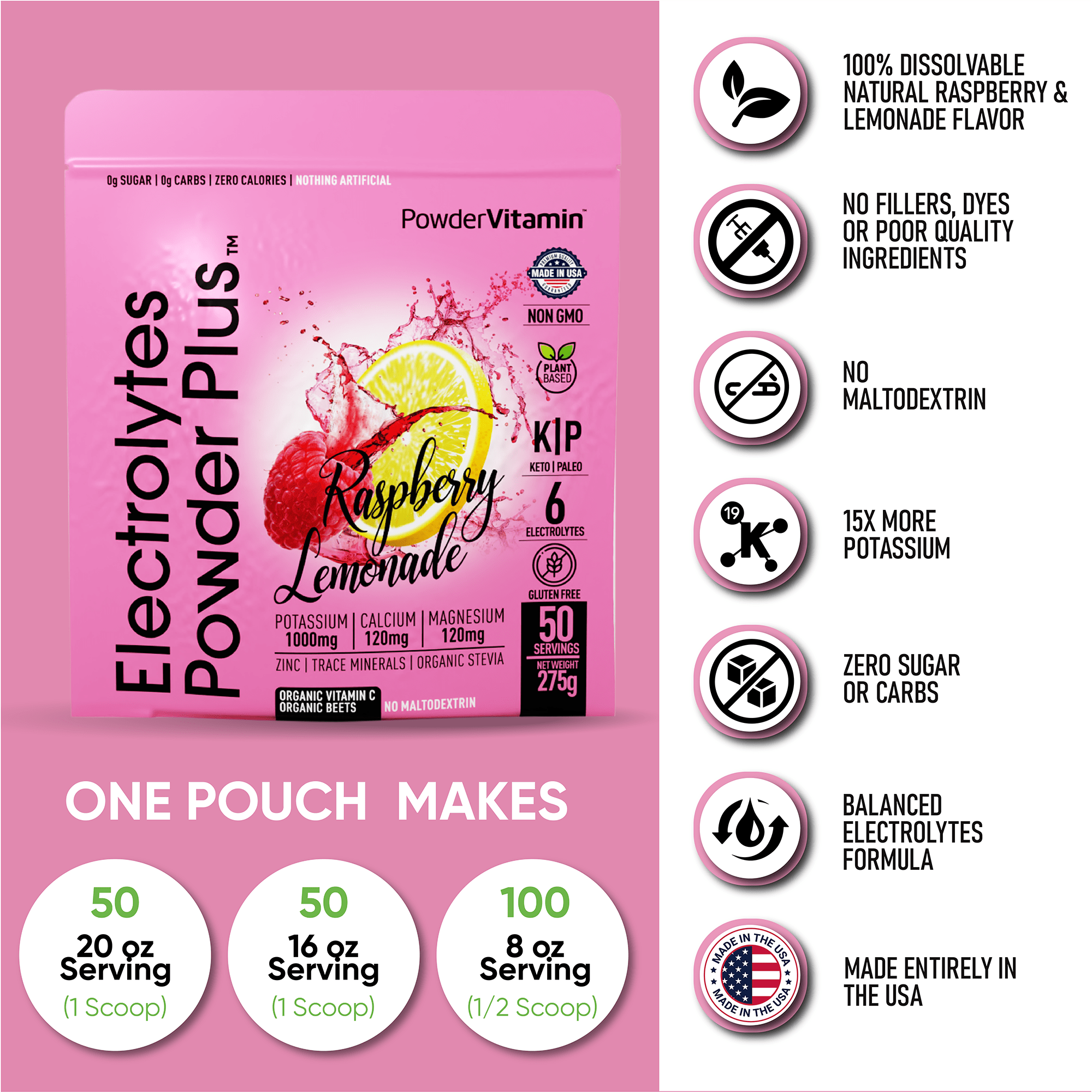Electrolyte Powder – Electrolytes Powder Plus contains 1000 mg of potassium opposed to only 250 mg in other brands. Additionally, we offer a unique flavor and blend of Magnesium, Calcium, Pink Himalayan salt. Our delicious and hydrating blend of Raspberry lemonade flavor includes 50 servings.