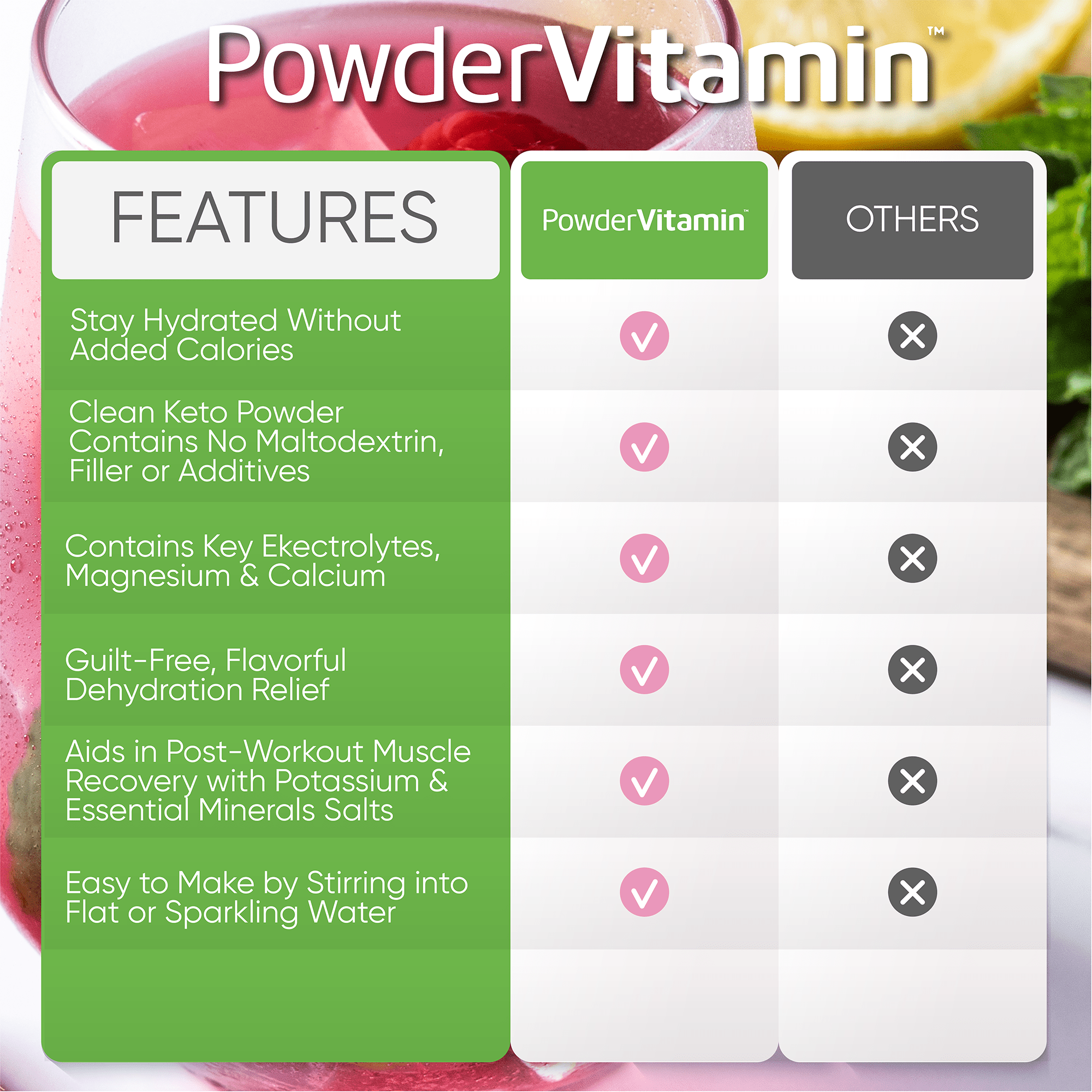 PowderVitamin Electrolytes Powder Plus™ is an advanced, balanced hydration drink with 6 essential electrolytes and trace minerals. Optimal hydration requires a good balance of electrolytes in the body. Essential electrolytes help you perform your best. The PowderVitamin Electrolytes Powder Plus™ formulation was created to support healthy hydration with real fruit flavors, plant-based colors, organic stevia leaf for sweetness. PowderVitamin Electrolytes Powder Plus™ has no sugar, calories or carbs so it’s compatible with any dietary plan.