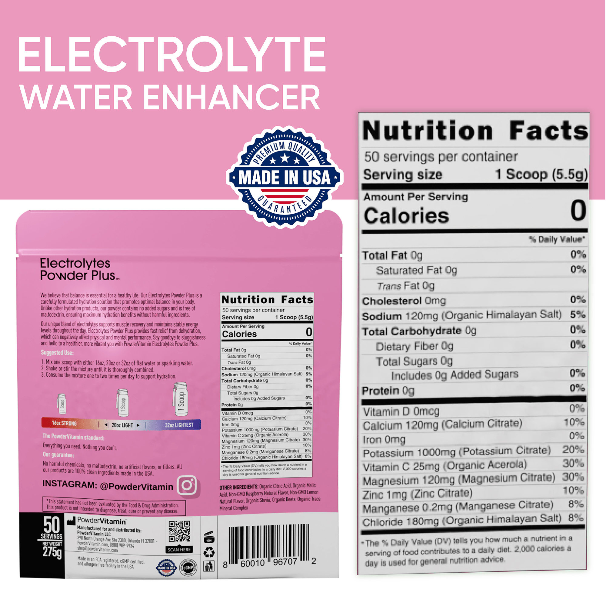 Electrolyte Water Enhancer – Packs 1000mg potassium, 120mg calcium, 120mg magnesium, organic beets, and organic Vitamin C + zinc into an energy-boosting, hydration drink mix with zero calories or sugar.