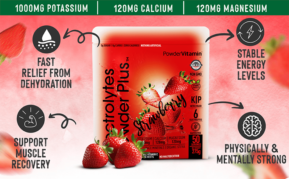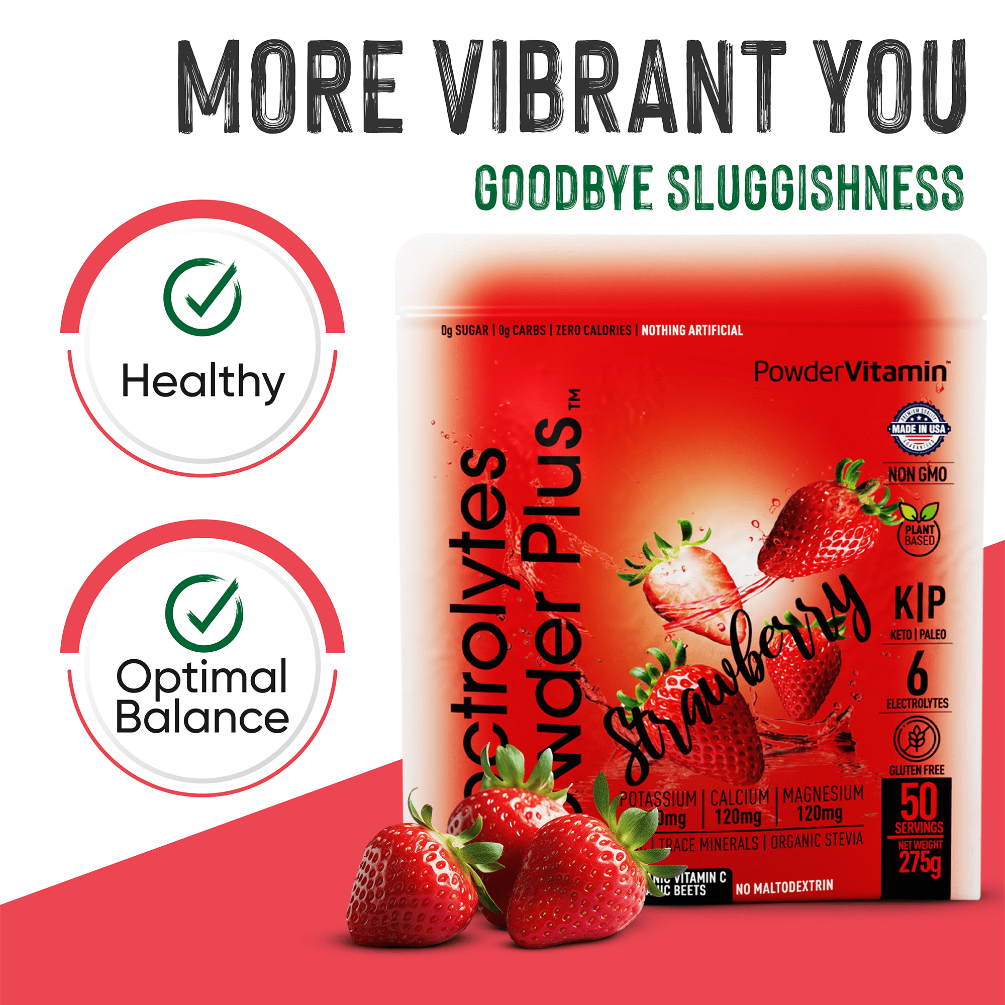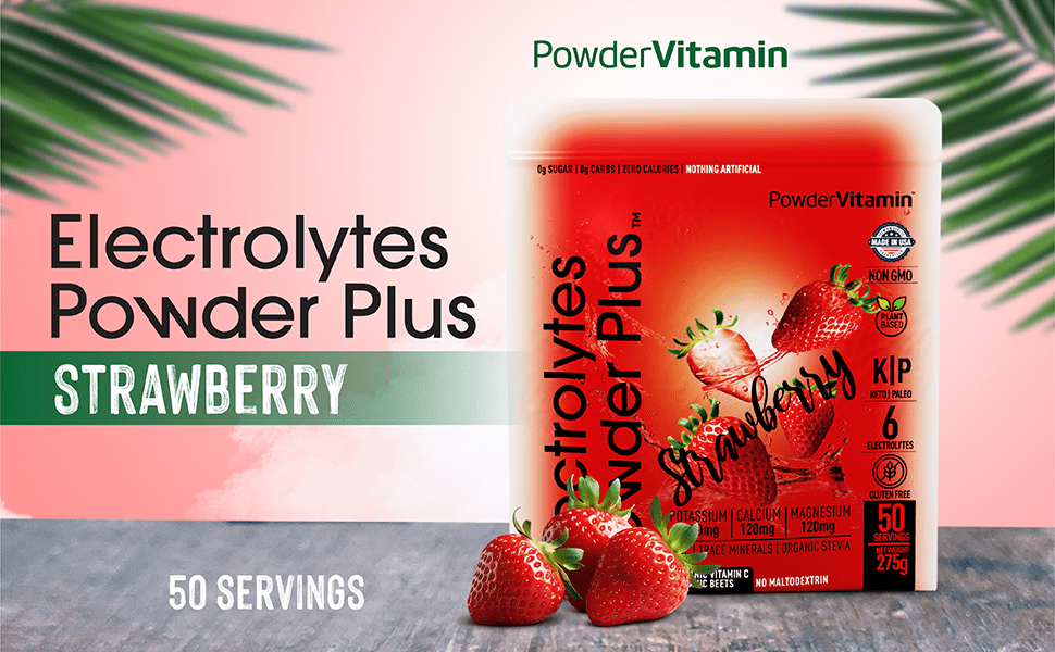 PowderVitamin Electrolytes Powder Plus™ is an advanced, balanced hydration drink with 6 essential electrolytes and trace minerals. Optimal hydration requires a good balance of electrolytes in the body. Essential electrolytes help you perform your best. The PowderVitamin Electrolytes Powder Plus™ formulation was created to support healthy hydration with real fruit flavors, plant-based colors, organic stevia leaf for sweetness. PowderVitamin Electrolytes Powder Plus™ has no sugar, calories or carbs so it’s compatible with any dietary plan.