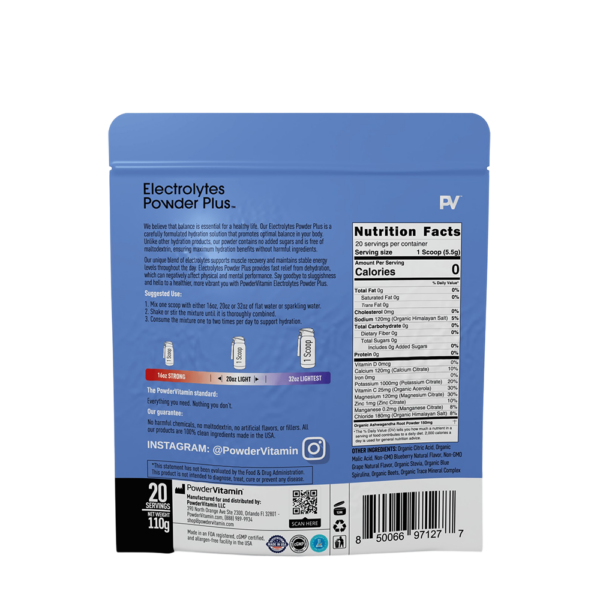 PowderVitamin Electrolytes Powder Plus™ is an advanced, balanced hydration drink with 6 essential electrolytes and trace minerals. Optimal hydration requires a good balance of electrolytes in the body. Essential electrolytes help you perform your best. The PowderVitamin Electrolytes Powder Plus™ formulation was created to support healthy hydration with real fruit flavors, plant-based colors, organic stevia leaf for sweetness. PowderVitamin Electrolytes Powder Plus™ has no sugar, calories or carbs so it’s compatible with any dietary plan.