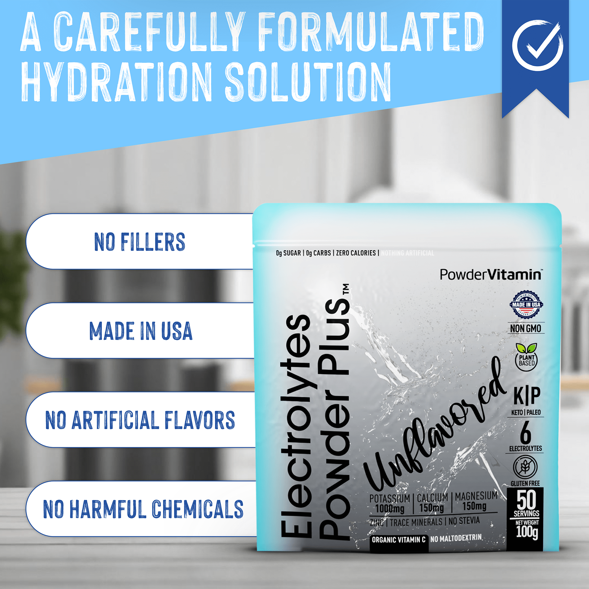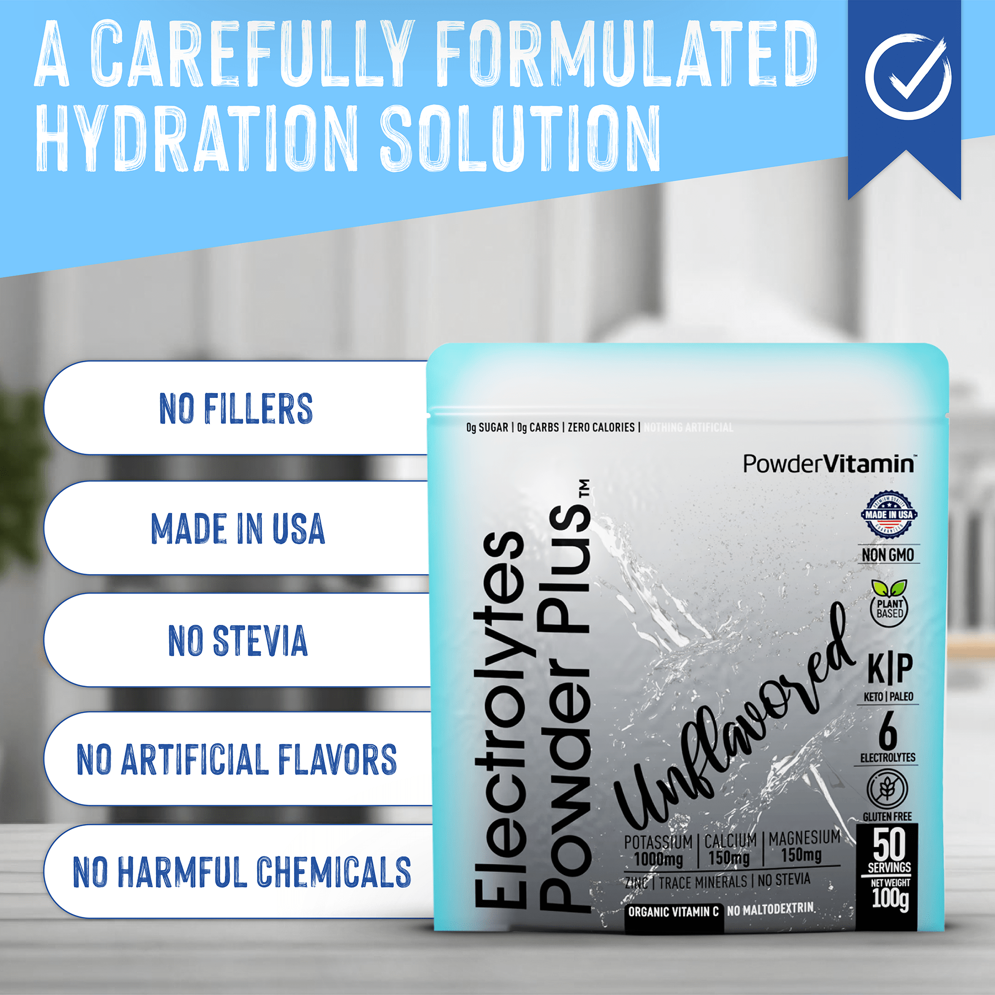 Electrolyte Water Enhancer – Packs 1000mg potassium, 150mg calcium, 150mg magnesium, NO stevia, and organic Vitamin C + zinc into an energy-boosting, hydration drink mix with zero calories or sugar.