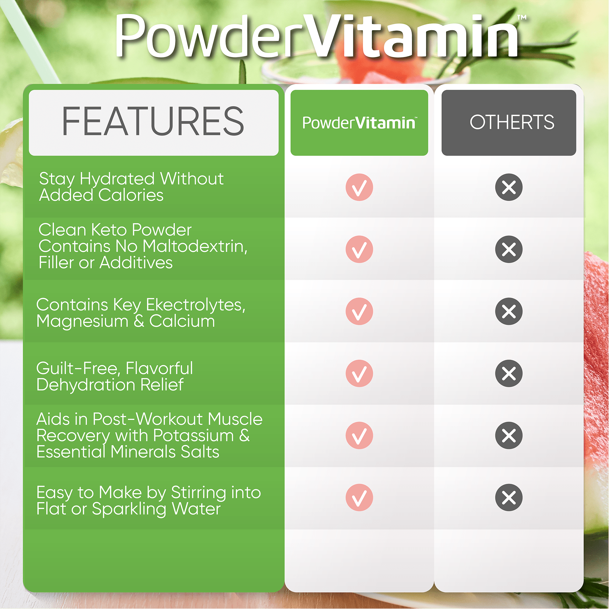 No, no and no! We promise, we never use synthetic colors, artificial flavors or sweeteners. All PowderVitamin Electrolytes Powder Plus colors and flavors come from fruit and vegetable extracts. Our sweetener is Organic Stevia Leaf Extract free of Maltodextrin. We also do not use any stimulants like caffeine. And our products are gluten-free, vegan, Paleo, Keto and Non-GMO.