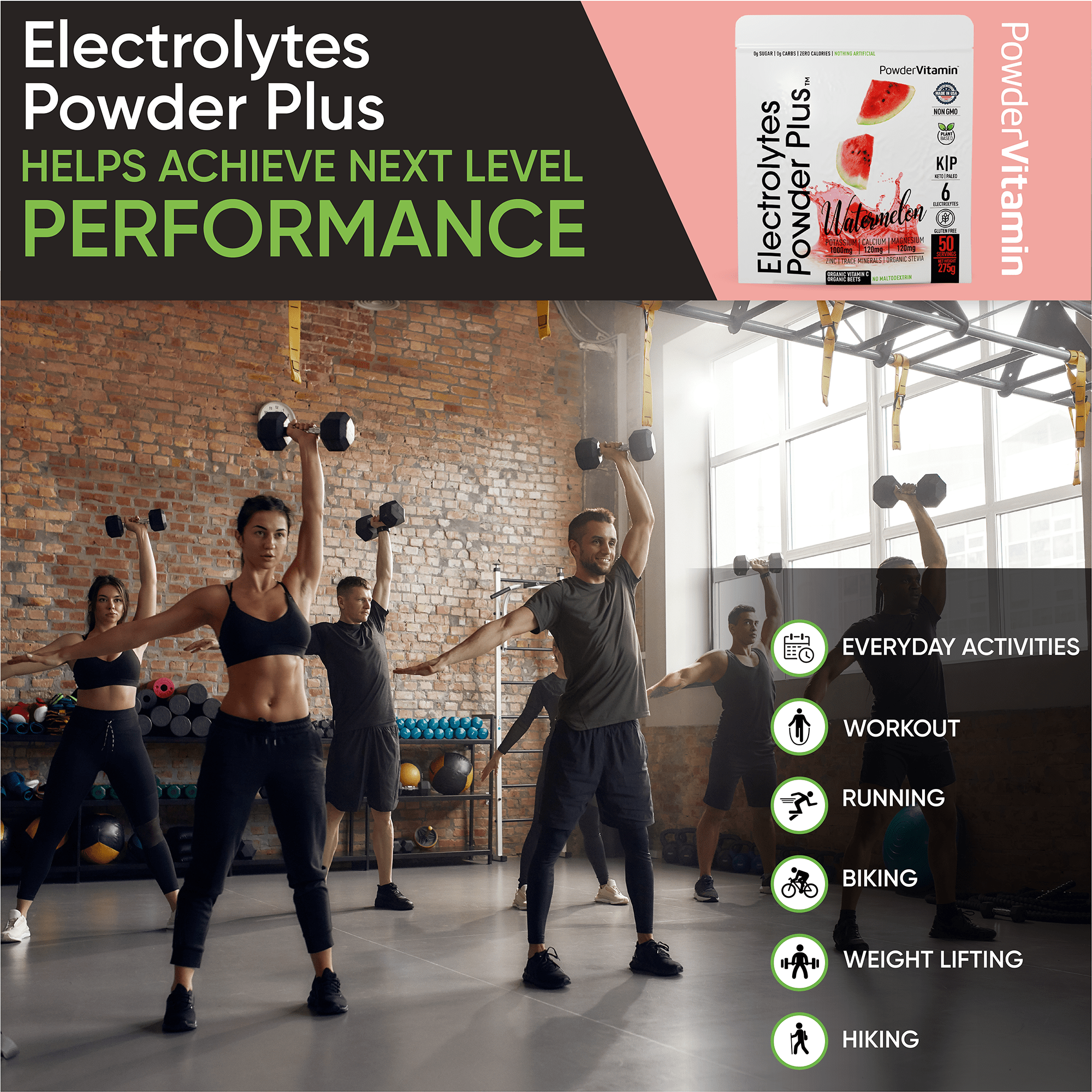 • Keep Yourself Hydrated: Without added calories. PowderVitamin Sugar-Free Electrolyte Powder Plus aids in per workout & post workout muscle recovery with potassium and essential mineral salts.